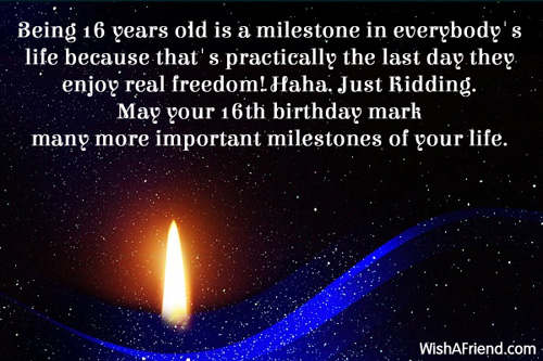 Being 16 years old is a milestone in everybody's life because that's practically the last day they enjoy real freedom! Haha. Just Kidding. May your 16th birthday mark many more important milestones of your life.