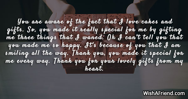 You are aware of the fact that I love cakes and gifts. So, you made it really special for me by gifting me three things that I waned. Oh I can't tell you that you made me so happy. It's because of you that I am smiling all the way. Thank you, you made it special for me every way. Thank you for your lovely gifts from my heart.